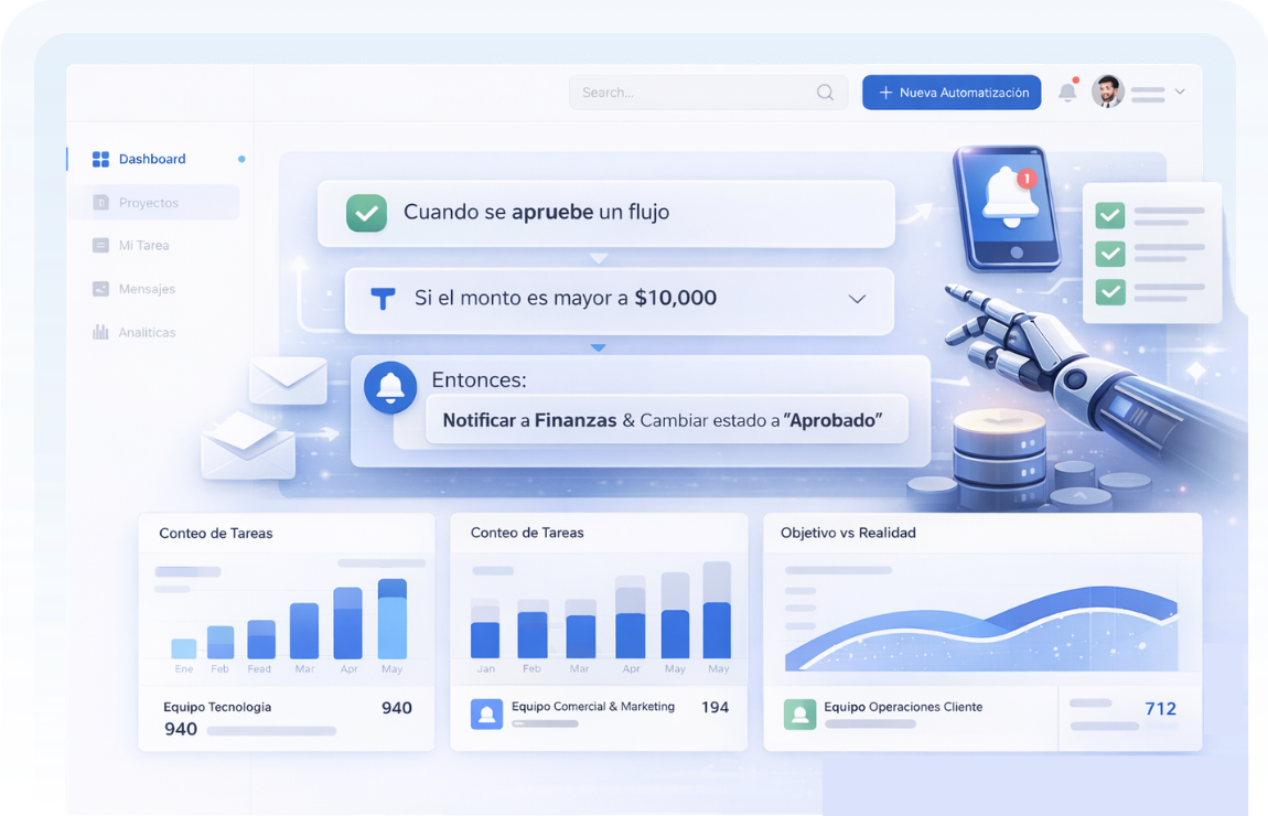 Convierte tareas repetitivas en flujos automáticos que se ejecutan solos.